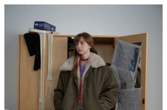 Stand Collar Panel Faux Fur Zip Buckle Jacket