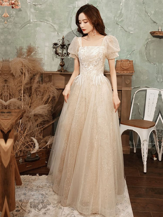 (Various Gown Evening Floral Designs) A-Line Puff-Sleeve Square-Neck Sequined