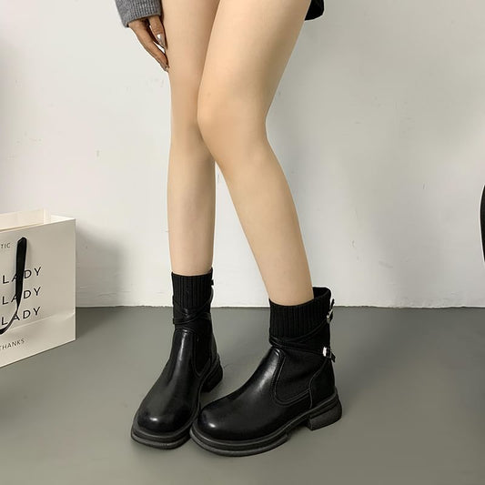Mesh Buckled Platform Short Panel Pointed Toe Boots
