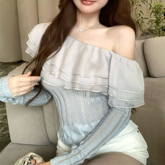 Long-Sleeve One Shoulder Plain Ruffle Trim Glitter Crop Top