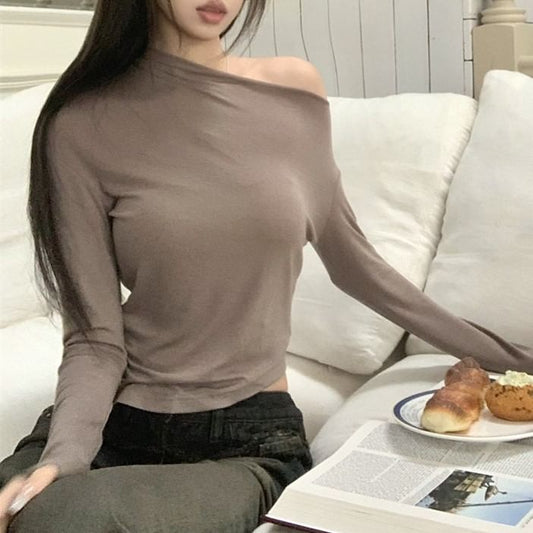 Long-Sleeve V-Neck Asymmetrical Plain Crop Top