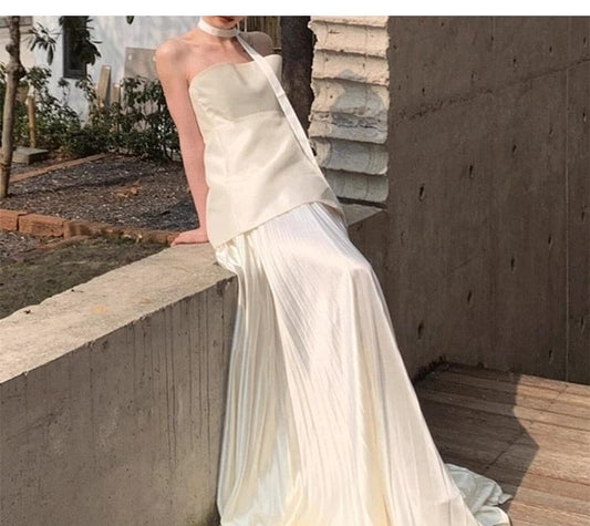 Set: Strapless Plain Pleated Trained A-Line Wedding Gown + Skinny Scarf