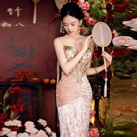 Set: Spaghetti Strap Floral Embroidered Sequin Ruched Mermaid Evening Gown + Skinny Scarf