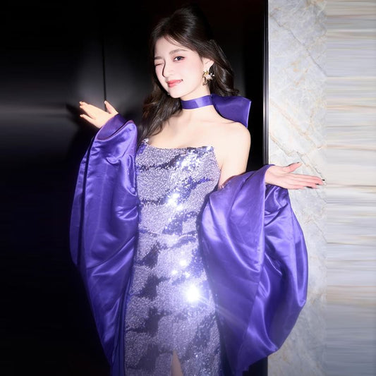 Set: Strapless Sequin Trained Slit Mermaid Evening Gown + Bow Choker + Shawl