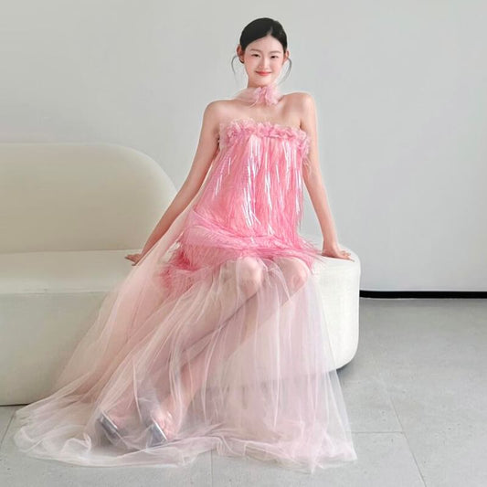 Sequin Evening Gown Strapless Mermaid Fur Scarf / Faux