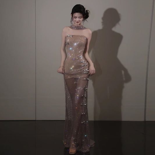 Choker-Neck Bow Back Sequined Bodycon Evening Gown