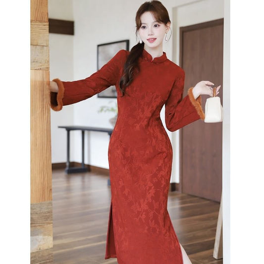Long Sleeve Fluffy Trim Fleece-Lined Jacquard Maxi Sheath Qipao / Plain Knit Scarf