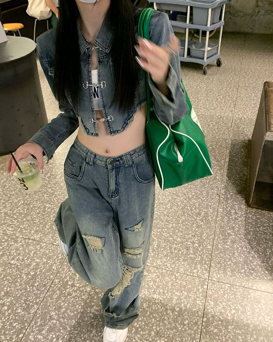 Collar Asymmetrical Fringed Washed Denim Crop Jacket / Mid Rise Distressed Wide Leg Jeans / Set