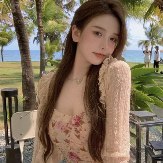 Plain Frill Trim Tie Front Lace Crop Light Jacket / Spaghetti Strap Floral Print Slit Midi Bodycon Dress