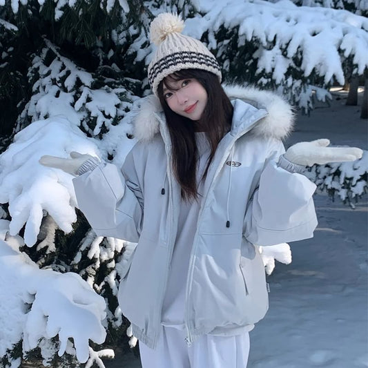 Long Sleeve Plain Loose-Fit Furry-Trim Hooded Jacket