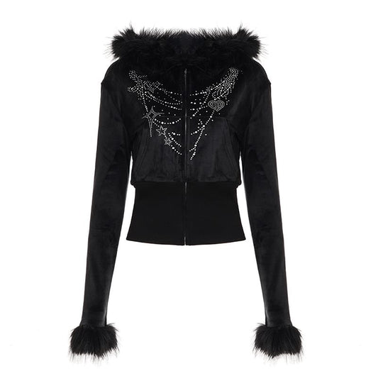 Long Sleeve Rhinestone Furry-Trim Velvet Hooded Zip-Up Jacket
