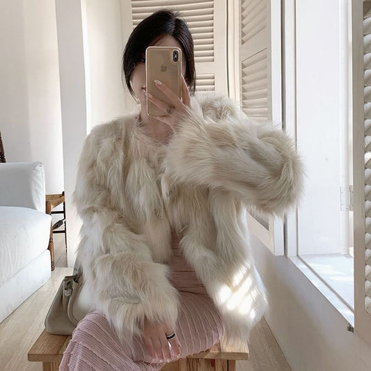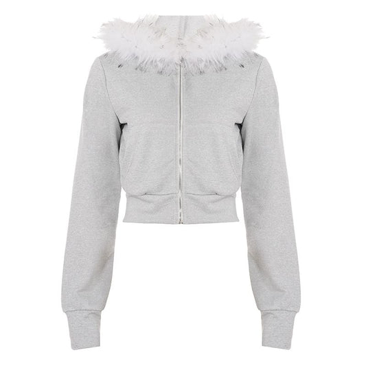 Long Sleeve Plain Furry Cropped Zip-Up Hooded Jacket