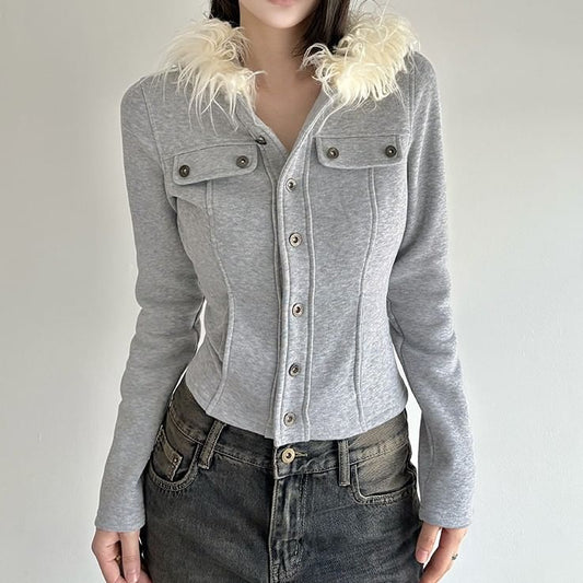 Long Sleeve Plain Faux Fur Trim Zip-Up Jacket