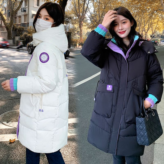 Lettering Applique Hooded Midi Zip Puffer Coat