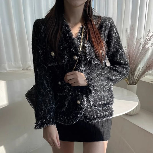 V-Neck Melange Fray Faux Pearl Button Jacket