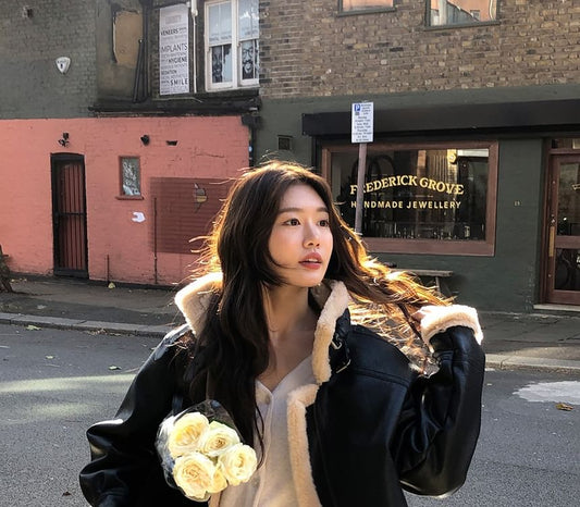 Collared Fluffy Panel Faux Leather Zip Jacket