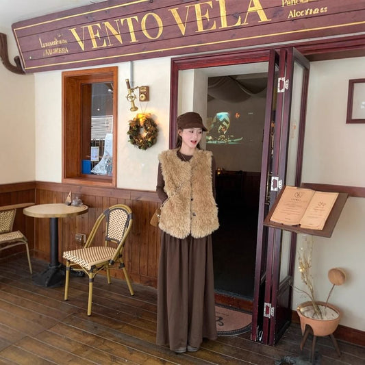 Faux Fur Vest / Long-Sleeve Top / High Rise Maxi A-Line Skirt
