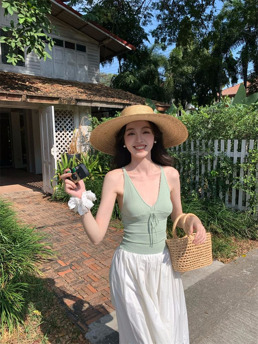 Spaghetti Strap V-Neck Plain Tie Neck Camisole Top