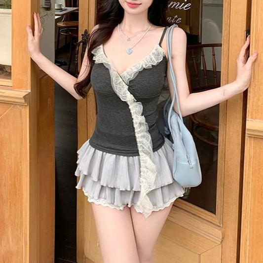 Cap-Sleeve Scoop Neck Plain Ruffle Cropped Tee / V-Neck Lace Trim Cami Top