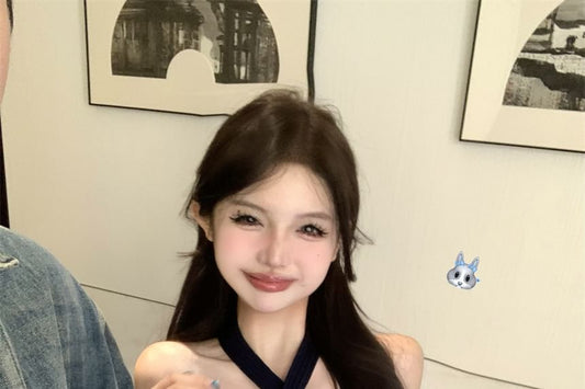 Halter Neck Plain Asymmetrical Buckled Ruched Open Back Top / High Waist Washed Wide Leg Jeans