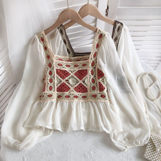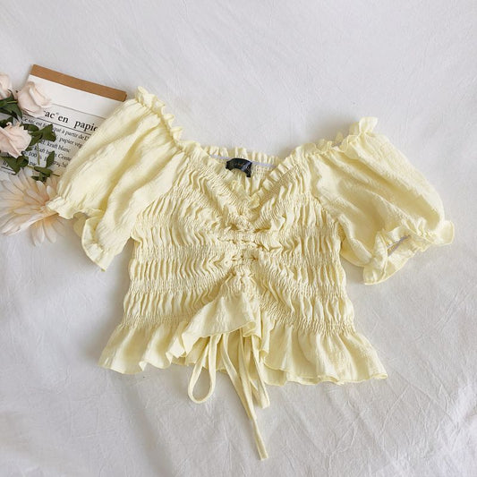 Puff-Sleeve V-Neck Plain Faux Pearl Lace Trim Blouse