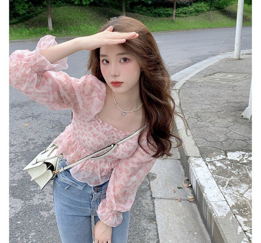 Puff-Sleeve Floral Print Ruffled Drawstring Blouse