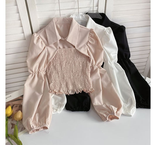 Puff-Sleeve Plain Smocked Shirred Blouse