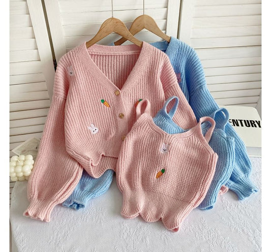 Set: Rabbit Embroidered Knit Cami Top + V-Neck Button-Up Cardigan