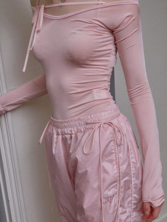 Pink Slim Long Sleeve Top Black Lace Up Cargo Pants Y2k - Heartzcore