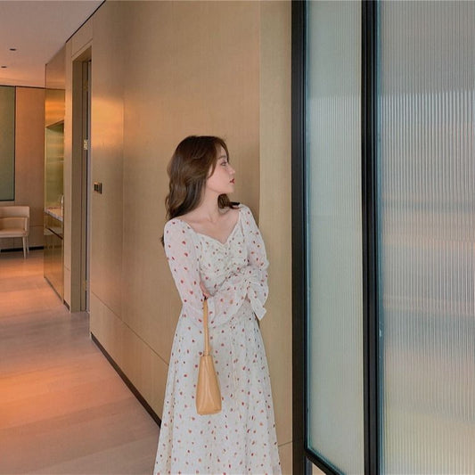 Long Sleeve Square Neck Drawstring Floral Chiffon Dress