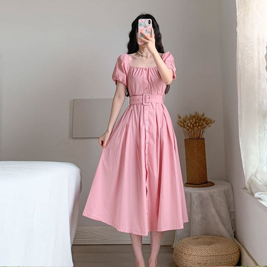 Short-Sleeve Open Back Plain Midi A-Line Dress