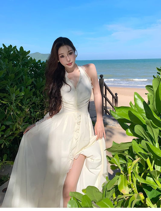 Ruffle Sleeveless Square Neck Plain Tie Back Maxi A