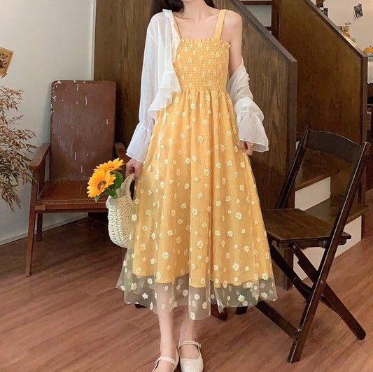 Flower Embroidered Single-Breasted Vest / Long-Sleeve Lace Trim Midi A-Line Dress