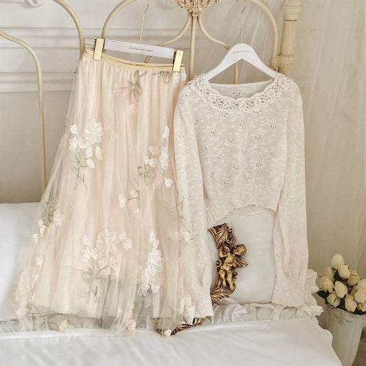 Flower Embroidered Mesh Midi A-Line Skirt