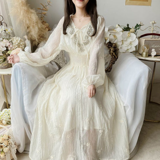 Puff-Sleeve V-Neck Flower Embroidered Rhinestone Maxi A-Line Dress