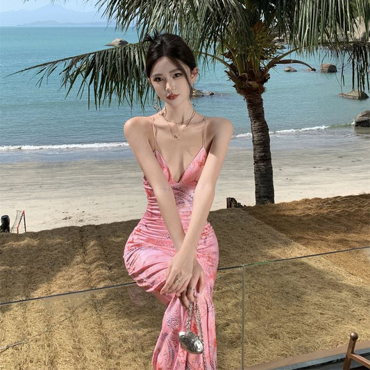 Spaghetti Strap Print Drawstring Open Back Midi A-Line Sundress