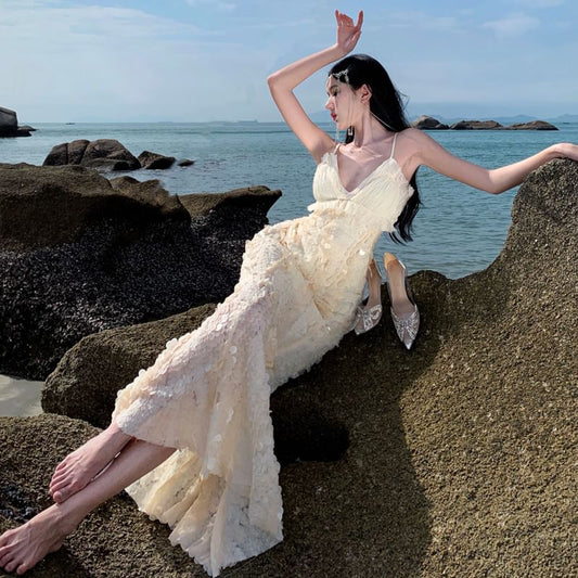 Spaghetti Strap V-Neck Plain Flower Maxi A-Line Dress