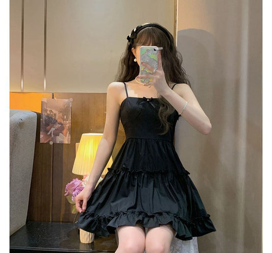Plain Bow Ruffle Crop Shirt / Spaghetti Strap Mini A-Line Dress