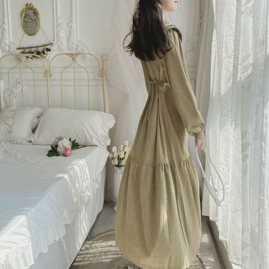 Long-Sleeve Collar Plain Corduroy Midi A-Line Dress