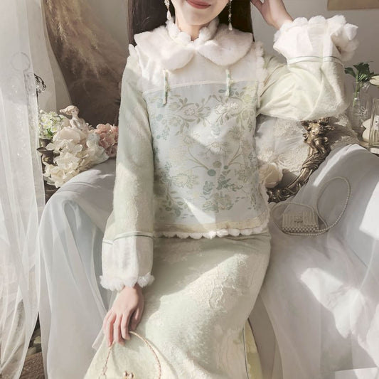 Long-Sleeve Band Collar Floral Fluffy Trim Qipao