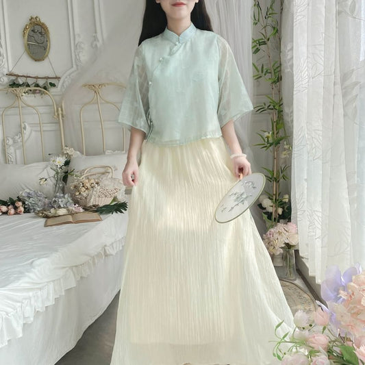 Set: Short-Sleeve Mandarin Collar Blouse + Pleated Midi A-Line Skirt