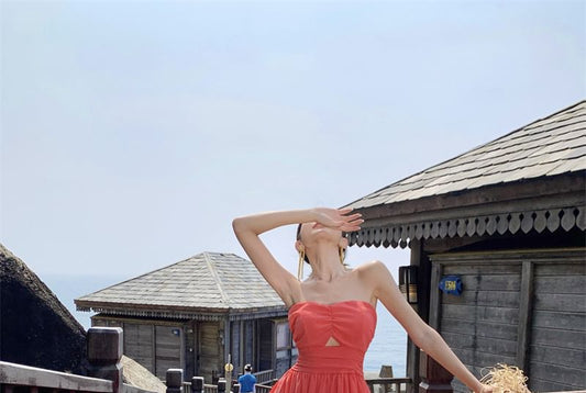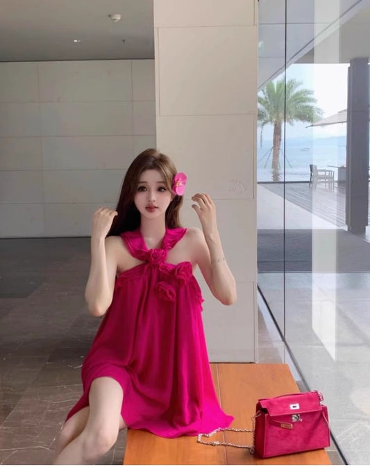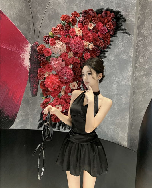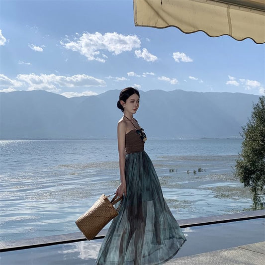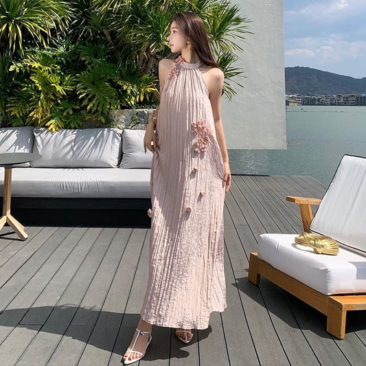 Sleeveless Halter Plain Accordion Pleated Midi A