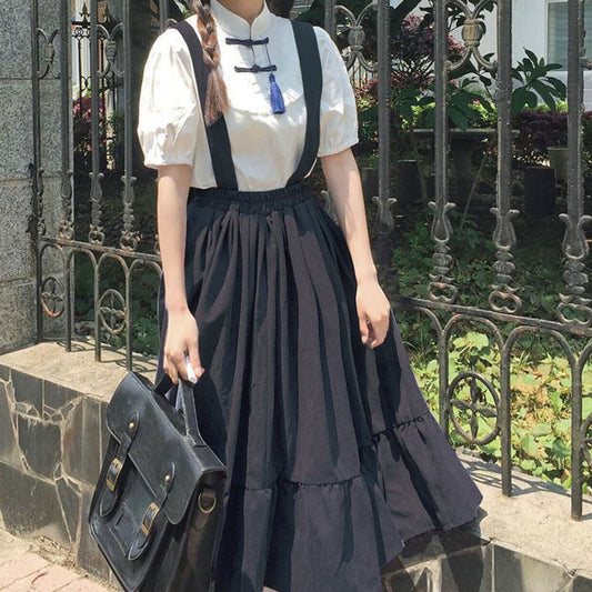 Vintage Buckle Tassel T-Shirt Suspender Skirt Set