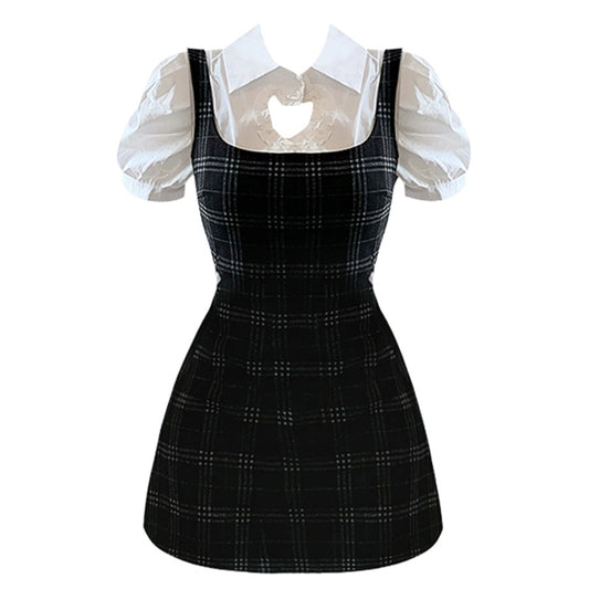 Love Heart Hollow Out T-Shirt Lace Up Plaid Dress Set