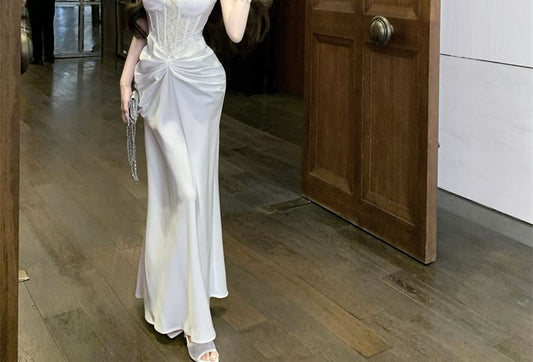 Plain Ruched Slit Trumpet Tube Evening Gown