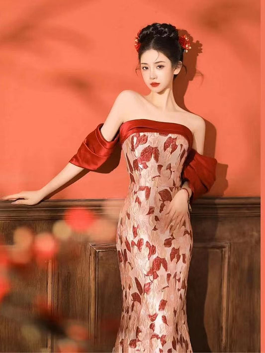 Long-Sleeve Floral Side-Slit Cutout Maxi Qipao