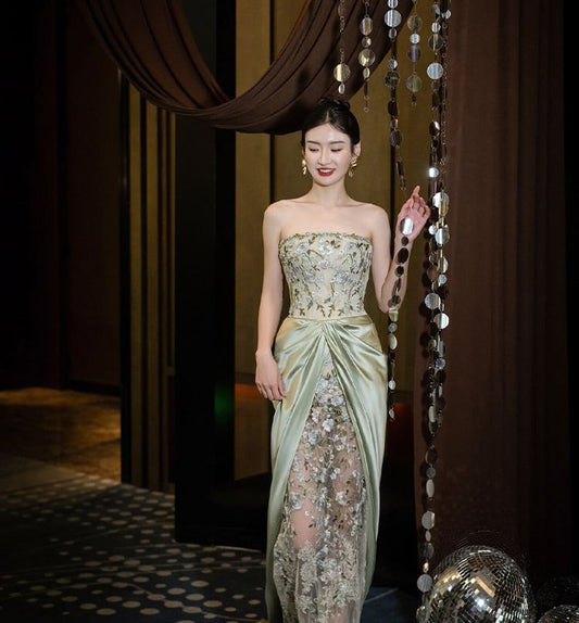 Floral Embroidered Ruched Mesh Panel Satin Sheath Tube Evening Gown