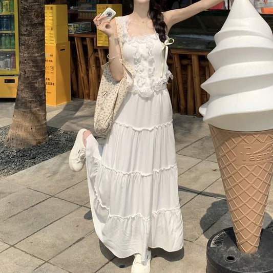 Plus Size Short-Sleeve Round Neck Lace Trim Midi A-Line Dress