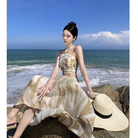 Set: Halter Neck Tie Dye Crop Cami Top + Mid Rise Midi A-Line Skirt
