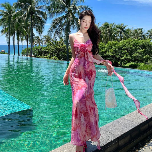 Puff-Sleeve V-Neck Butterfly Print Lace Trim Maxi A-Line Dress